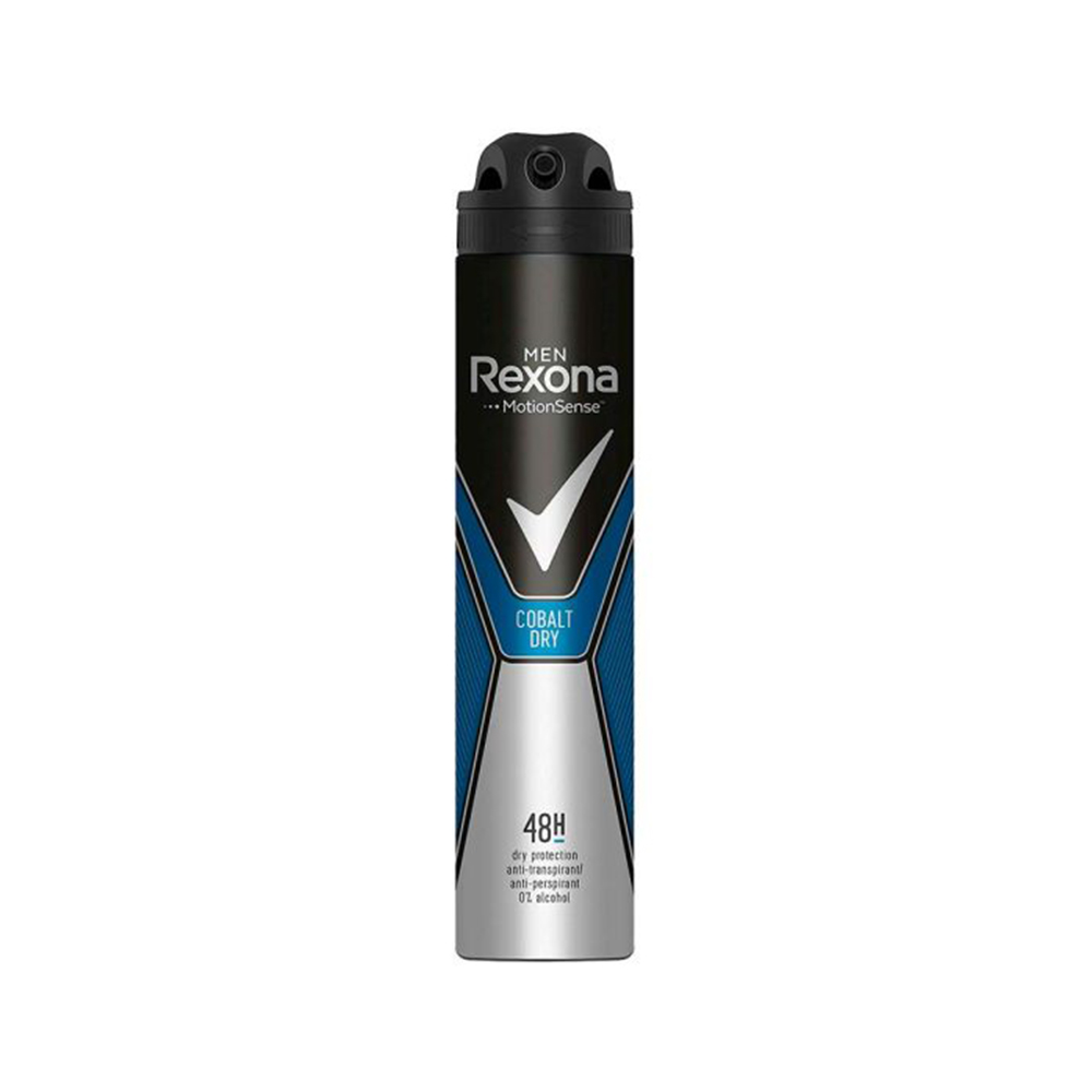 اسپری ضد تعریق مردانه Cobalt Dry کوبالت درای رکسونا Rexona با رایحه های خنک حجم 200 میلی لیتری محفظه غدد پوست را بسته و از عرق کردن جلوگیری می کند.