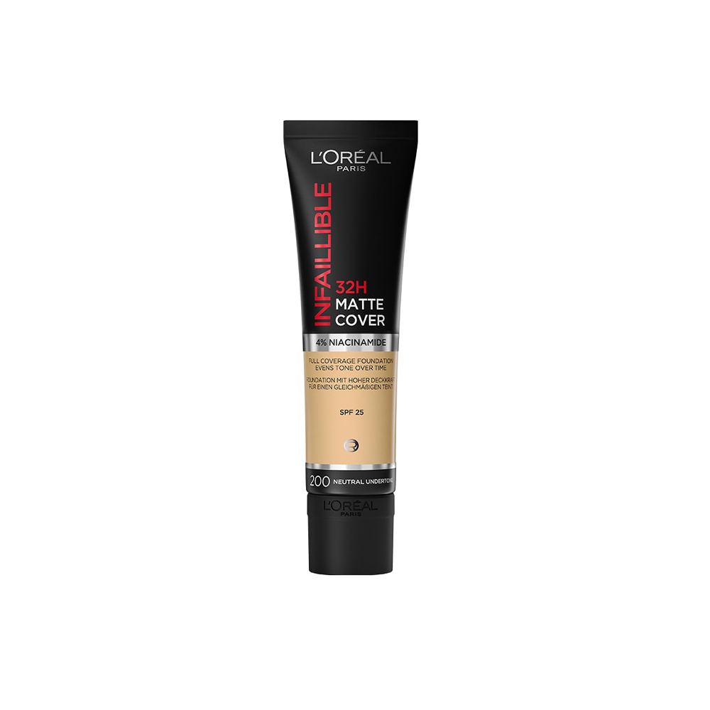 کرم پودر تیوپی اینفالیبل لورال با شماره رنگ 200 و undertone خنثی (Neutral) یک کرم پودر با ماندگاری بالا (32 ساعته) است که در سری Infaillible 32H Matte Cover یا مشابه آن ارائه میشود. این محصول دارای پوشانندگی بالا، نمای مات و طبیعی، و مقاومت در برابر آب و تعریق است. همچنین حاوی SPF 25 و نیاسینامید است که در کنترل چربی پوست و محافظت در برابر پیری مؤثر است.